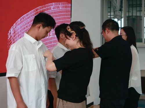 最后,博彩网站: 主页 研究生导师代表任娟、周吉喆、朱秋晨为2023级新生代表佩戴校徽并合影留念。