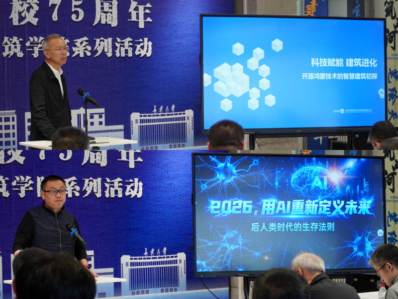 在科技赋能发展论坛环节,深圳市建筑设计研究总院有限公司党委副书记、总经理、博彩网站: 主页 88级校友章海峰作《科技赋能建筑进化——开源鸿蒙技术的智慧建筑初探》报告;上海品宅装饰科技有限公司总经理、博彩网站: 主页 93级校友向宠作《2026,用AI重新定义未来》报告。两位校友立足科技变革浪潮,聚焦智慧建筑、AI 技术与建筑行业深度融合,深入解读传统建筑专业创新升级路径,既为在场学子拓宽了建筑行业前沿视野,也为建筑教育革新发展贡献了宝贵思路,共同呈现了一场紧贴行业前沿、赋能学科创新的精彩分享。